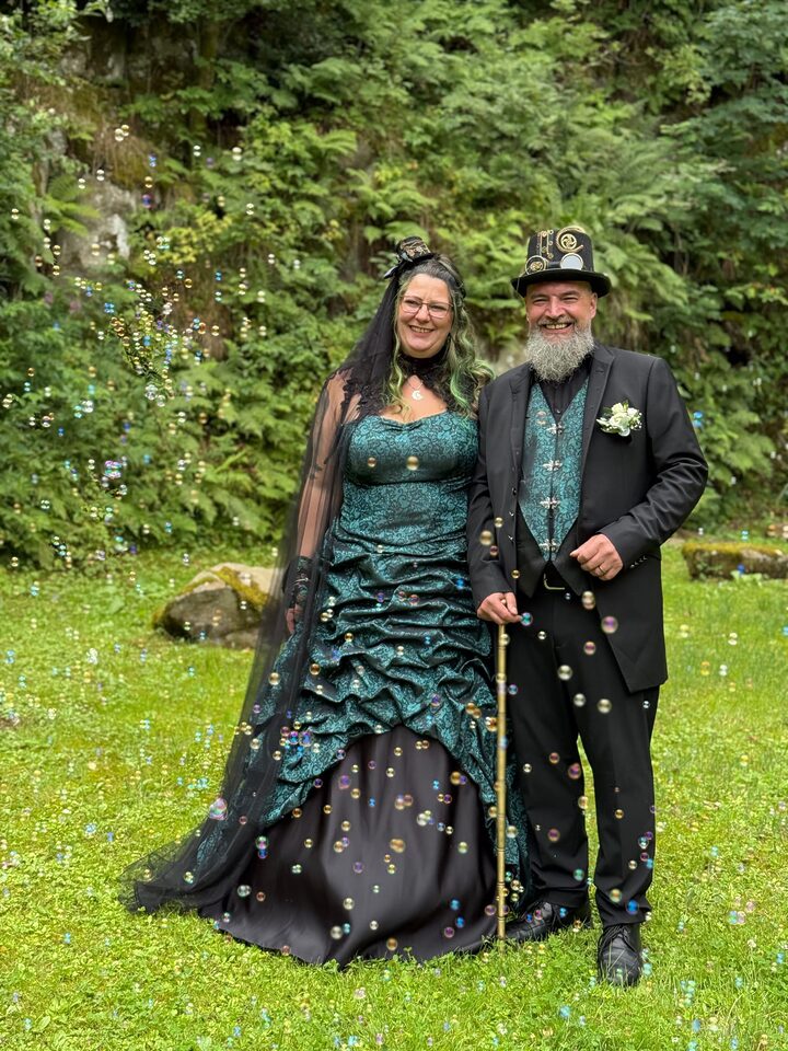Ob ein sinnliches schwarzes Brautkleid, ein viktorianisch inspiriertes Ensemble, ein detailreiches Steampunk-Outfit oder ein extravagantes Herrenensemble – bei uns entstehen Looks, die zu dir und deinem besonderen Tag passen. Jedes Stück wird maßgeschneidert und mit viel Liebe zum Detail umgesetzt. So wird dein Hochzeitsoutfit zu einem echten Unikat, das deine Persönlichkeit und euren individuellen Stil widerspiegelt.